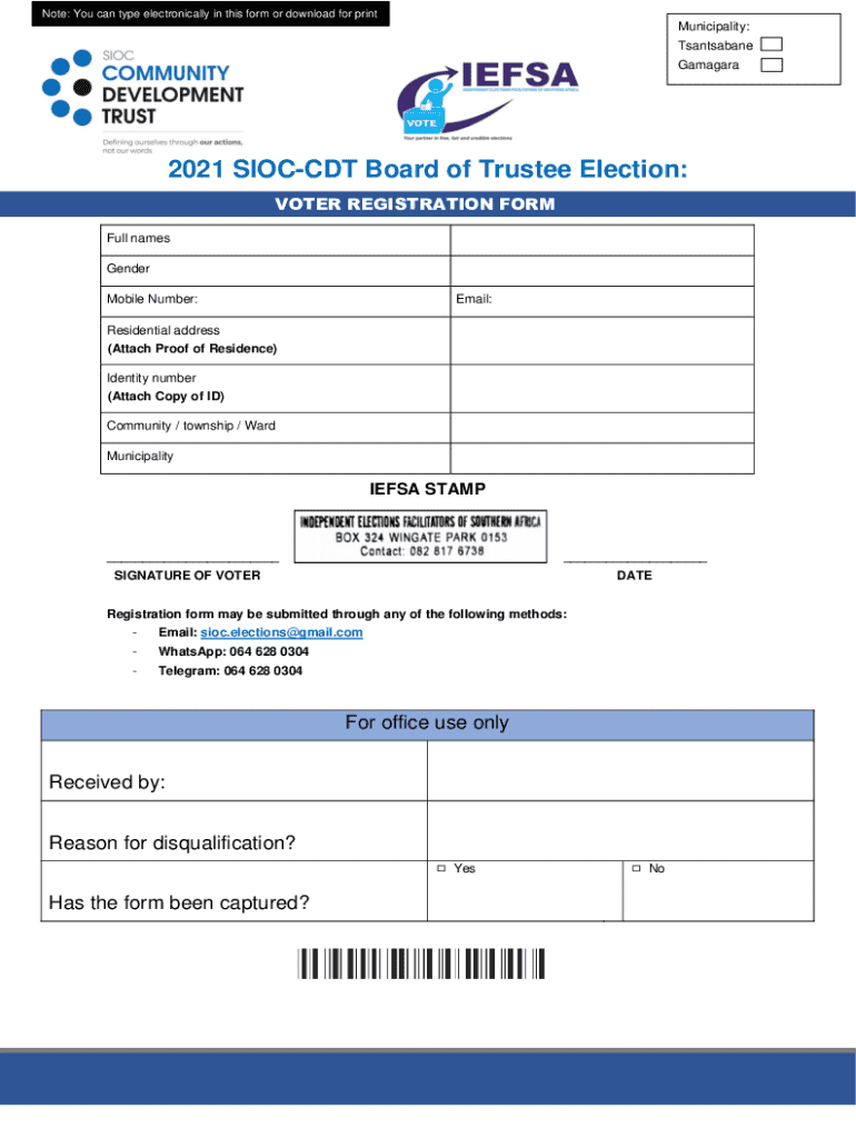 Note: You can type electronically in this form or download for printMunicipality: Tsantsabane Gamagara2021 SIOCCDT Board of Trustee Election: VOTER REGISTRATION FORM Full names Gender Mobile Number:Email:Residential