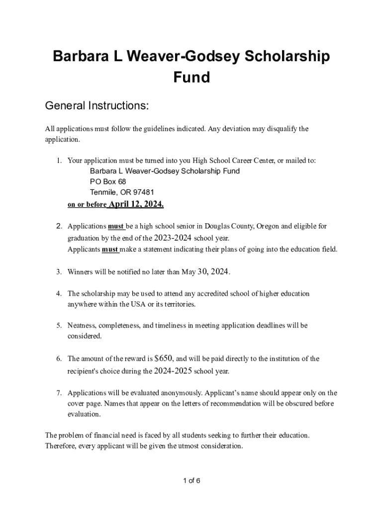 Barbara L WeaverGodsey Scholarship Fund General Instructions: ll applications must follow the guidelines indicated. Any deviation may disqualify the A application. 1. Your application must be turned
