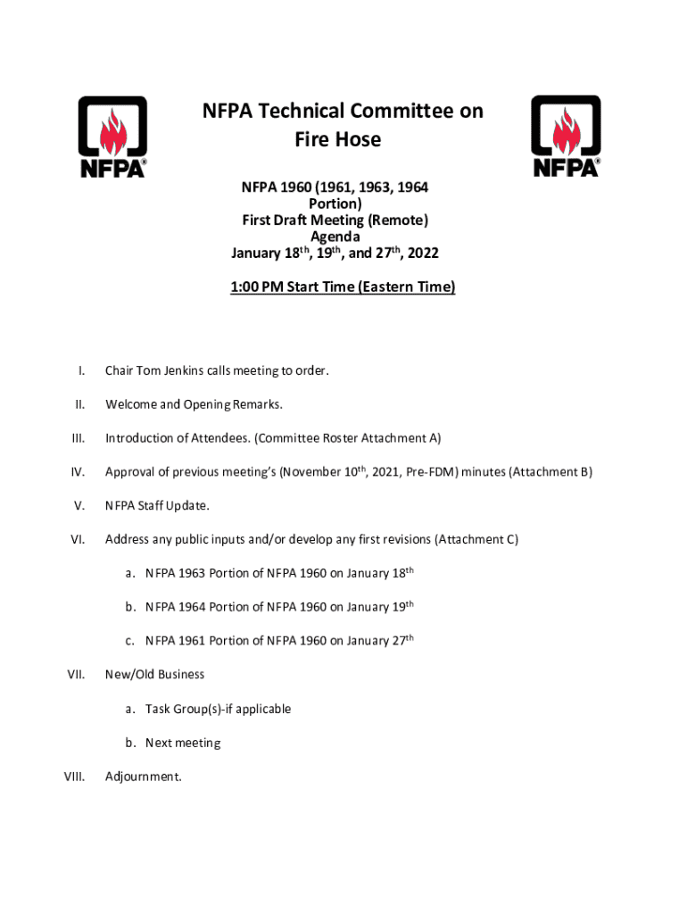 This document outlines the agenda for the NFPA Technical Committee on Fire Hose\'s First Draft Meeting scheduled for January 18th, 19th, and 27th, 2022. It includes welcoming remarks, updates from NFPA staff, public inputs, revisions discussions, and meeting adjournment details.