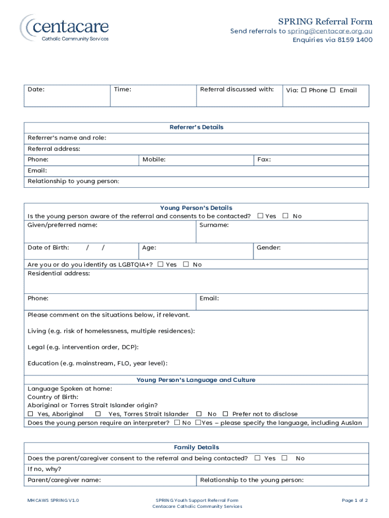 SPRING Referral Form Send referrals to spring@centacare.org.au Enquiries via 8159 1400Date:Time:Referral discussed with:Via: Phone EmailReferrers Details Referrers name and role: Referral address: