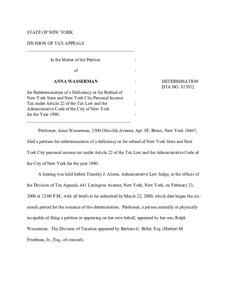 This document outlines the determination of a tax appeal case involving Anna Wasserman, who petitioned for a redetermination of a deficiency or for a refund of New York State and City personal income tax for the year 1990. The case discusses the denial of the refund claim by the Division of Taxation based on statutory limitations under Tax Law § 687(a).
