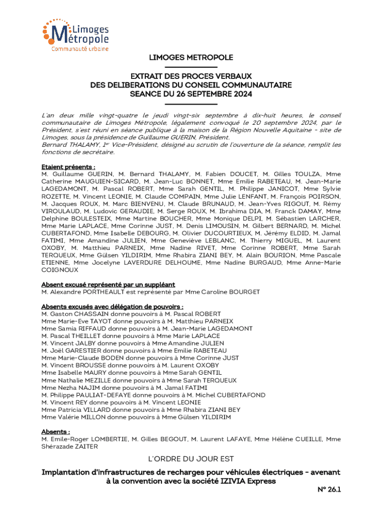 LIMOGES METROPOLE EXTRAIT DES PROCES VERBAUX DES DELIBERATIONS DU CONSEIL COMMUNAUTAIRE SEANCE DU 26 SEPTEMBRE 2024 Lan deux mille vingtquatre le jeudi vingtsix septembre dixhuit heures, le conseil