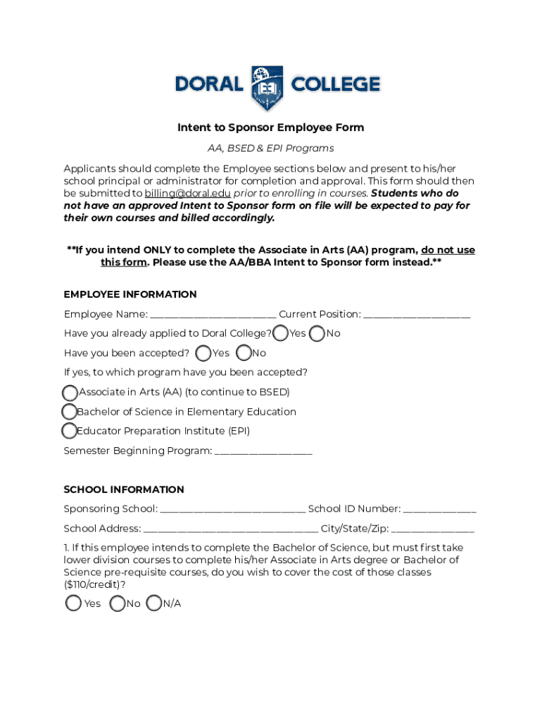 Intent to Sponsor Employee Form AA, BSED & EPI Programs Applicants should complete the Employee sections below and present to his/her school principal or administrator for completion and approval.