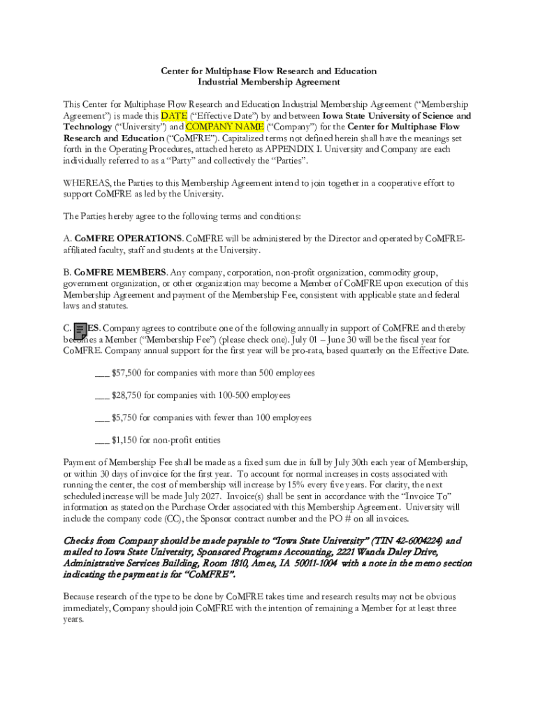 This document outlines the terms and conditions of the Industrial Membership Agreement between Iowa State University and an industrial member for the Center for Multiphase Flow Research and Education (CoMFRE). It details membership fees, responsibilities of both parties, confidentiality, intellectual property rights, liability, and termination conditions.