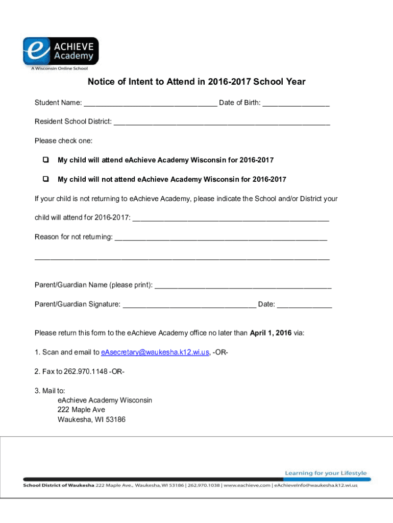 Notice of Intent to Attend in 20162017 School Year Student Name: ___ Date of Birth: ___ Resident School District: ___ Please check one: My child will attend eAchieve Academy Wisconsin for 20162017My