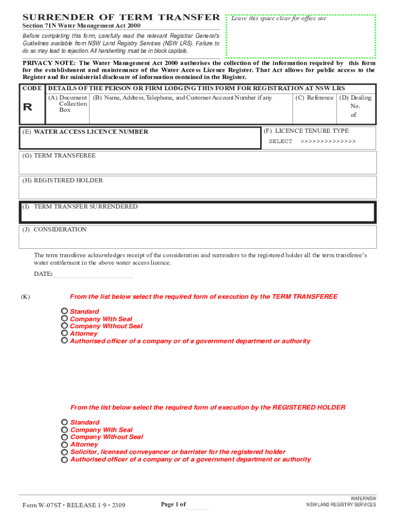 This form is required for the surrender of a term transfer under the Water Management Act 2000. It must be completed in accordance with the guidelines provided by NSW Land Registry Services, ensuring all information is accurate for the maintenance of the Water Access Licence Register.