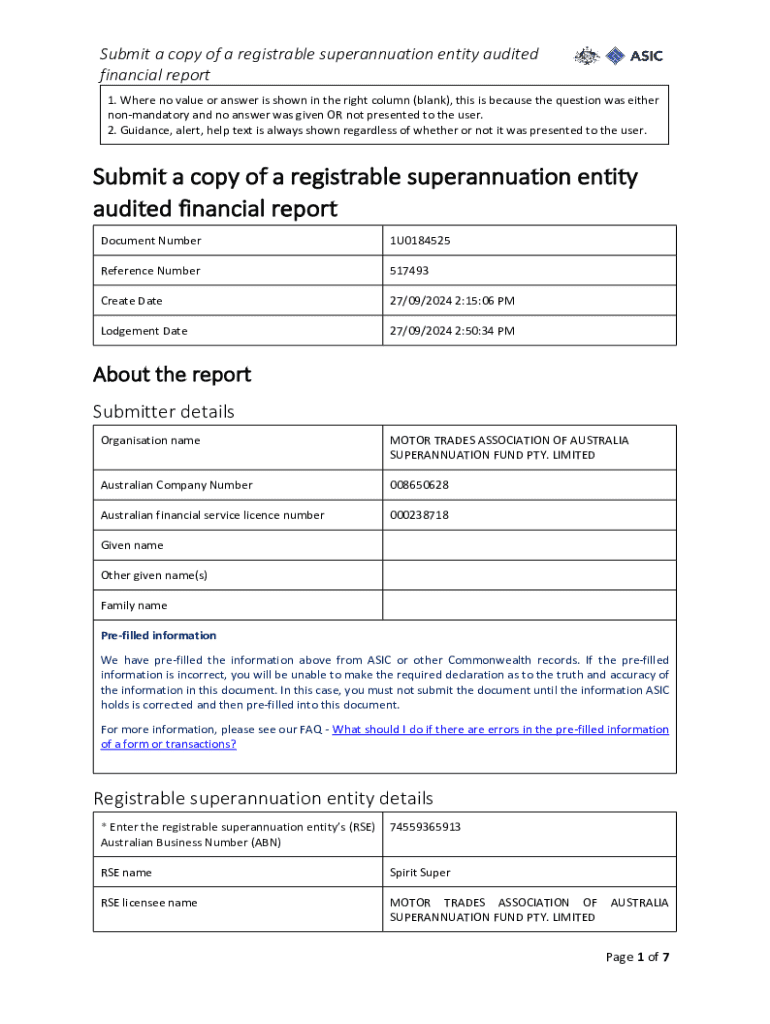 This document is the audited financial report for Spirit Super for the financial year ended 30 June 2024. It includes details on the fund\'s performance, financial position, investment strategy, member benefits, and compliance with regulatory requirements. The report covers contributions, member liabilities, operating expenses, and provides insights into the fund\'s management and operational strategies.