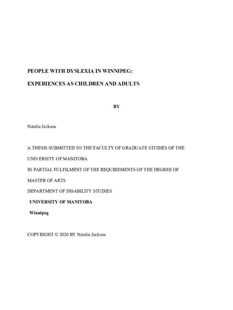 PEOPLE WITH DYSLEXIA IN WINNIPEG: EXPERIENCES AS CHILDREN AND ADULTSBYNatalia JacksonA THESIS SUBMITTED TO THE FACULTY OF GRADUATE STUDIES OF THE UNIVERSITY OF MANITOBA IN PARTIAL FULFILMENT OF THE