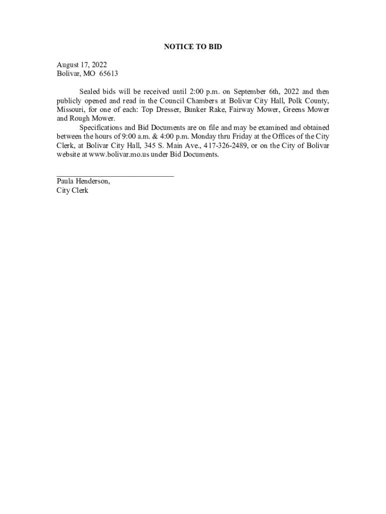 Get the free NOTICE TO BID August 17, 2022 Bolivar, MO 65613 Sealed ... - bolivar mo