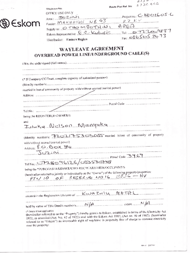 zlJ\"\'\'Route PlanRefNo:L7 32 4\'sProject no.\'Askom*:.bP .9.\"L aS \" LvEastern RegionWAYLEAVE AGREEMENT OVERHEADPowERLINE/UNDERGROUNDCABLE(S) l/We, the undersigned (full names)\"persons) (* If