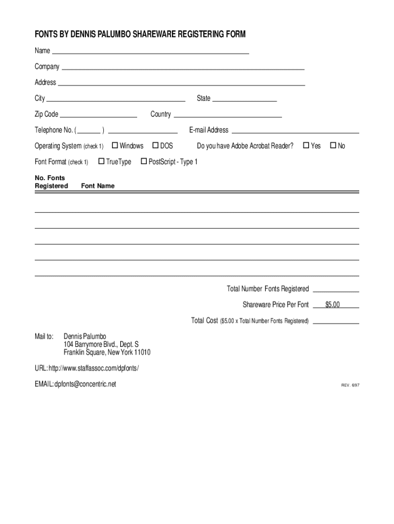 FONTS BY DENNIS PALUMBO SHAREWARE REGISTERING FORM Name Company Address CityStateZip CodeCountryTelephone No. ()Email AddressOperating System (check 1) Font Format (check 1) No. Fonts RegisteredWindows