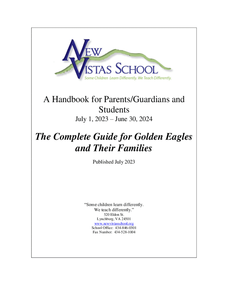 This handbook serves as a comprehensive guide for parents, guardians, and students at New Vistas School for the academic year July 1, 2023 – June 30, 2024. It includes essential information on school policies, programs, schedules, faculty, and student life, aimed at supporting the academic and personal growth of students with learning, attention, and emotional challenges.