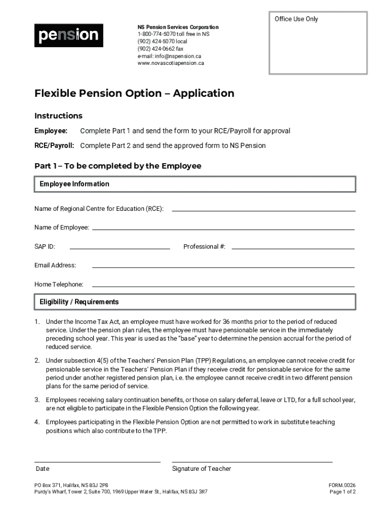 Office Use Only NS Pension Services Corporation 18007745070 toll free in NS (902) 4245070 local (902) 4240662 fax email: info@nspension.ca www.novascotiapension.caFlexible Pension Option Application