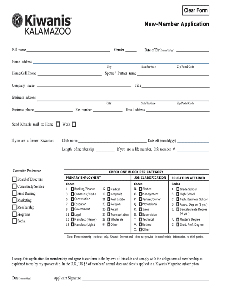 Clear Form NewMember ApplicationFull nameGenderHome addressDate of Birth (mm/dd/yy)CityHome/Cell PhoneState/ProvinceZip/Postal CodeState/ProvinceZip/Postal CodeSpouse/ Partner nameCompany nameTitleBusiness