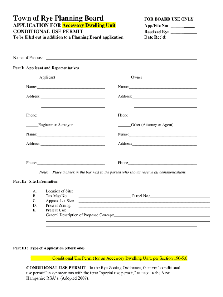 This application is submitted to the Town of Rye Planning Board for obtaining a Conditional Use Permit for an Accessory Dwelling Unit (ADU). It outlines the necessary details, requirements, and fees associated with the application process, including specifics on zoning, permits, and criteria that must be met for approval.