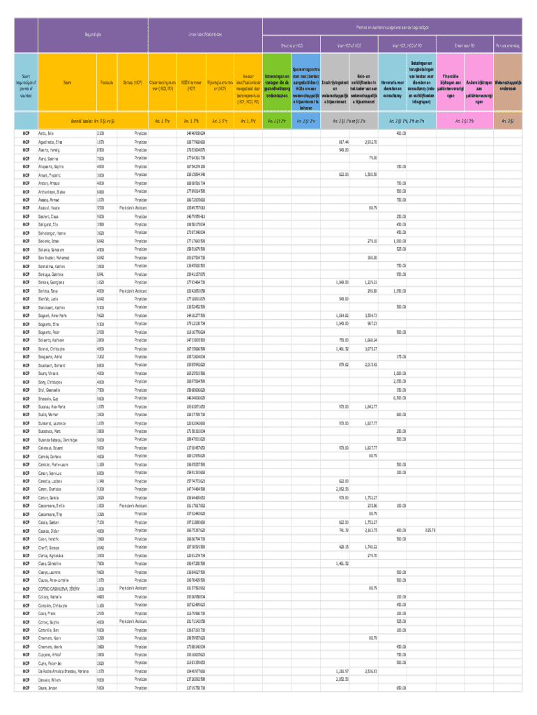 Premies en voordelen toegekend aan de begunstigde BegunstigdeUniek identificatiemiddel Enkel voor HCOSoort begunstigde of premie of voordeelNaamPostcodeBeroep (HCP)Koninkl. besluit: Art. 5 1 en 2Ondernemingsnum