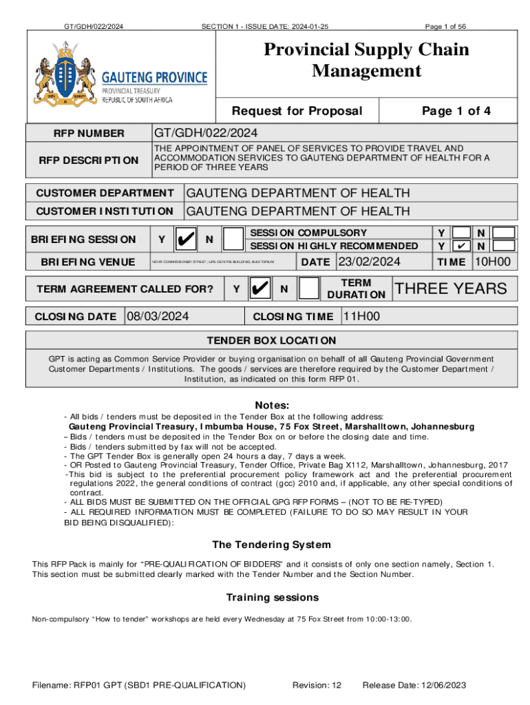 This document outlines the Request for Proposal (RFP) for the appointment of a panel of services to provide travel and accommodation services to the Gauteng Department of Health for a period of three years. It includes details on submission requirements, evaluation criteria, conditions, and procedures for bidders.