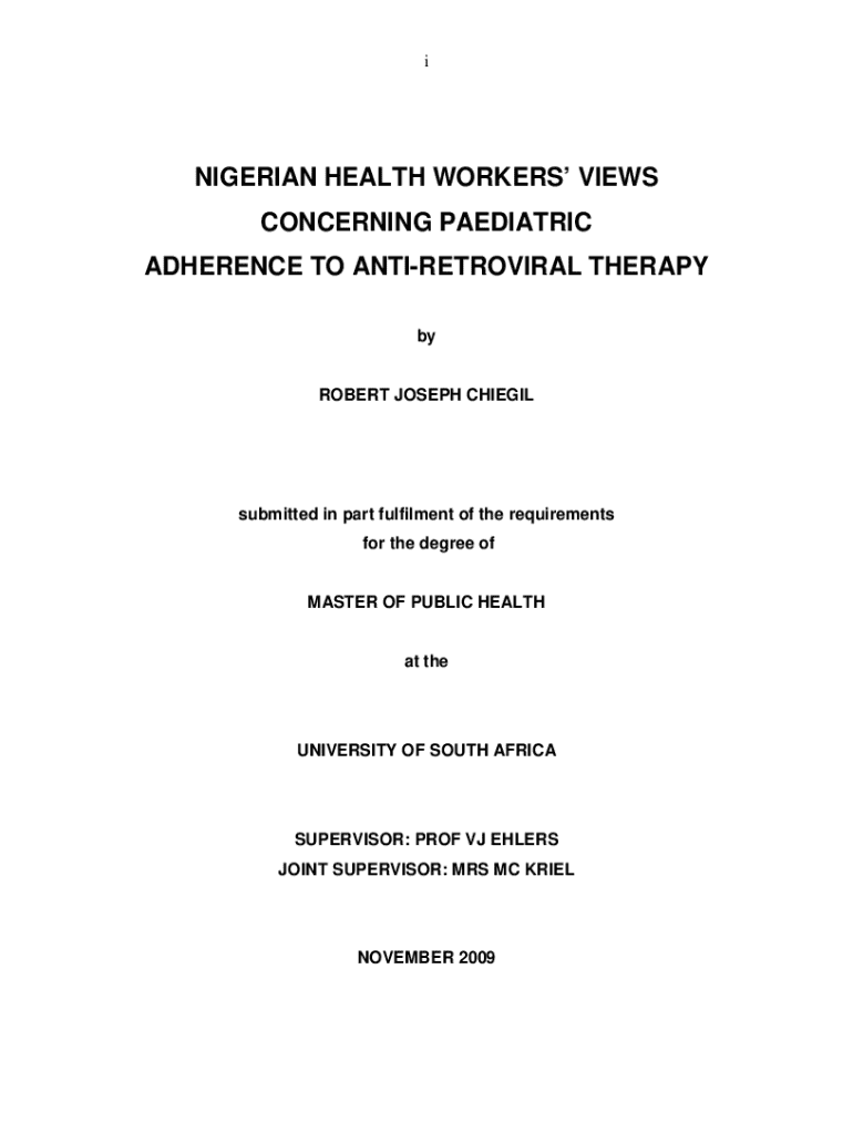 iNIGERIAN HEALTH WORKERS VIEWS CONCERNING PAEDIATRIC ADHERENCE TO ANTIRETROVIRAL THERAPY byROBERT JOSEPH CHIEGILsubmitted in part fulfilment of the requirements for the degree ofMASTER OF PUBLIC HEALTHat