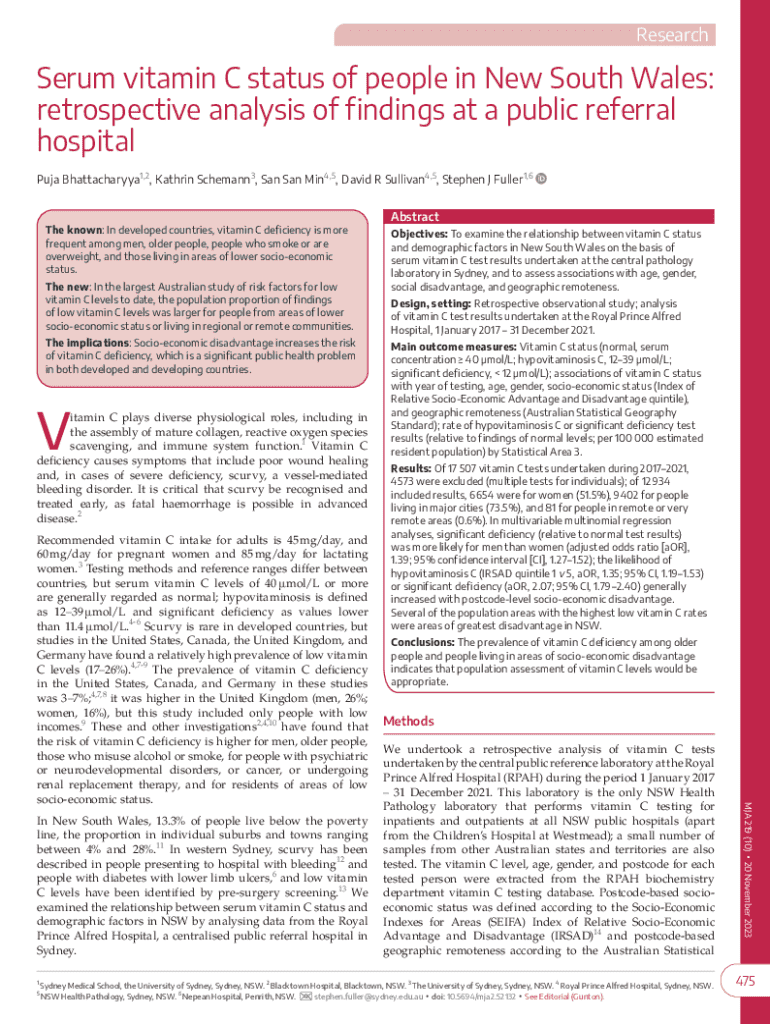 ResearchSerum vitamin C status of people in New South Wales: retrospective analysis of findings at a public referral hospital Puja Bhattacharyya1,2, Kathrin Schemann3, San San Min4,5, David R Sullivan4,5,