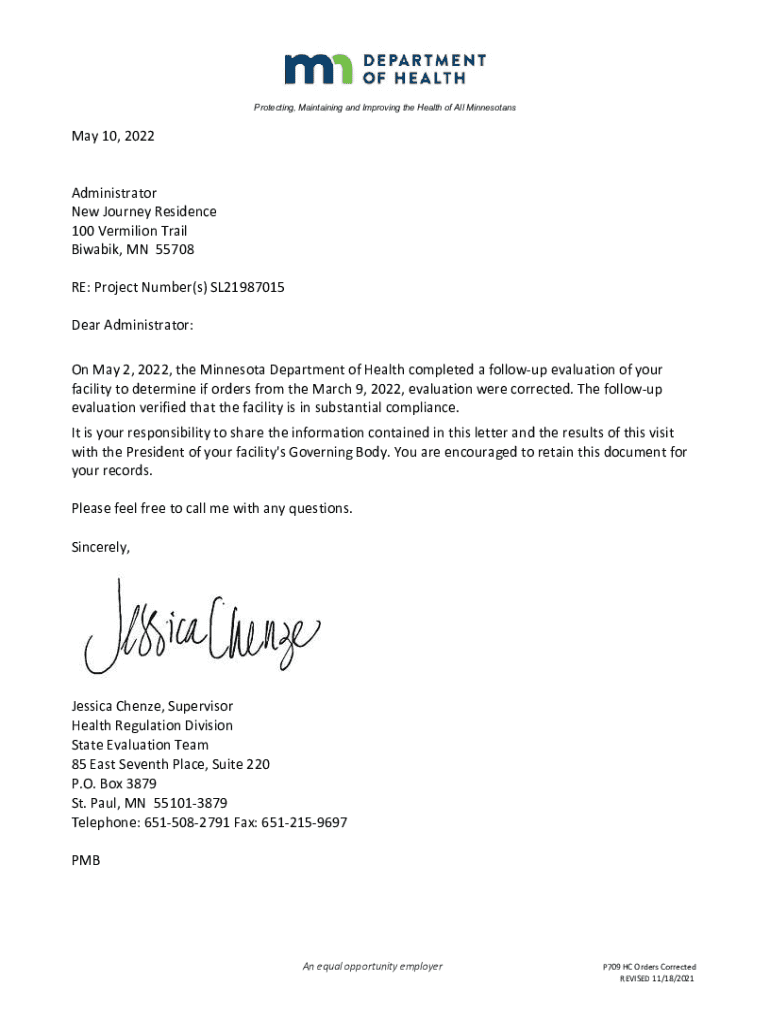 Protecting, Maintaining and Improving the Health of All MinnesotansMay 10, 2022 Administrator New Journey Residence 100 Vermilion Trail Biwabik, MN 55708 RE: Project Number(s) SL21987015 Dear Administrator:
