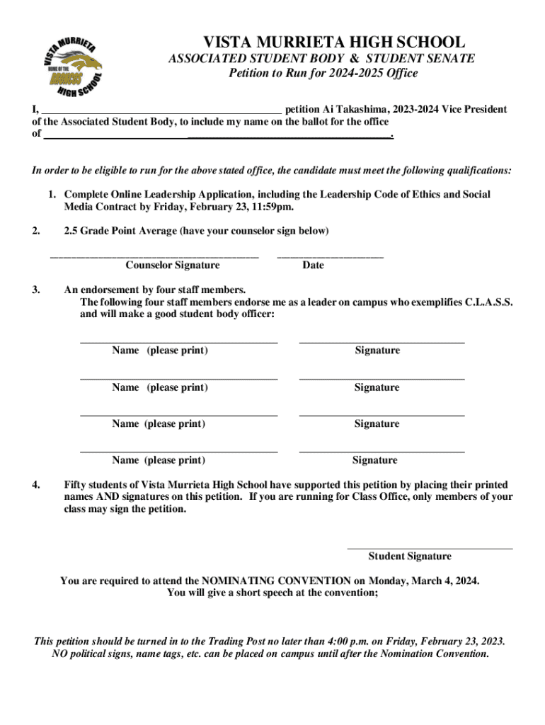 VISTA MURRIETA HIGH SCHOOL ASSOCIATED STUDENT BODY & STUDENT SENATE Petition to Run for 20242025 Office I, ___ petition Ai Takashima, 20232024 Vice President of the Associated Student Body, to include