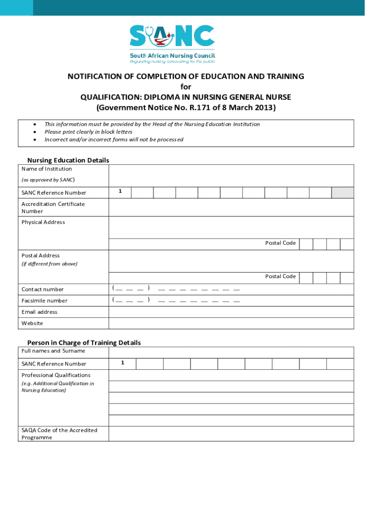 This document serves as a formal notification that a student has completed their education and training for the Diploma in Nursing as outlined by the Nursing Education Institution and conforms to governmental regulations. It requires detailed information about the institution, the student, and the courses completed, including assessments and practical training.