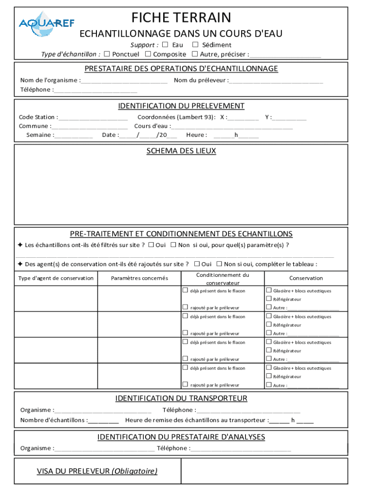 FICHE TERRAIN ECHANTILLONNAGE DANS UN COURS D\'EAU Support : Eau Sdiment Type d\'chantillon : Ponctuel Composite Autre, prciser :___PRESTATAIRE DES OPERATIONS D\'ECHANTILLONNAGE Nom de l\'organisme
