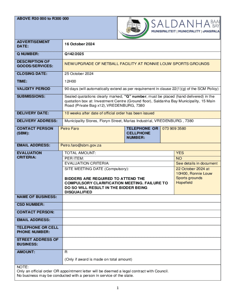 ABOVE R30 000 to R300 000ADVERTISEMENT DATE:16 October 2024Q NUMBER:Q142/2025DESCRIPTION OF GOODS/SERVICES:NEW/UPGRADE OF NETBALL FACILITY AT RONNIE LOUW SPORTS GROUNDSCLOSING DATE:25 October 2024TIME:12H00VALIDITY