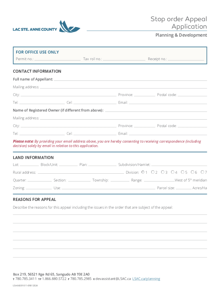 Stop order Appeal Application Planning & DevelopmentFOR OFFICE USE ONLY Permit no.:Tax roll no.:Receipt no.:CONTACT INFORMATION Full name of Appellant:Mailing address:City:Province:Postal code:Tel:Cel:Email:Name