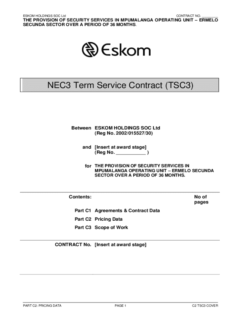 ESKOM HOLDINGS SOC LtdCONTRACT NO. ___THE PROVISION OF SECURITY SERVICES IN MPUMALANGA OPERATING UNIT ERMELO SECUNDA SECTOR OVER A PERIOD OF 36 MONTHS.NEC3 Term Service Contract (TSC3)Between ESKOM