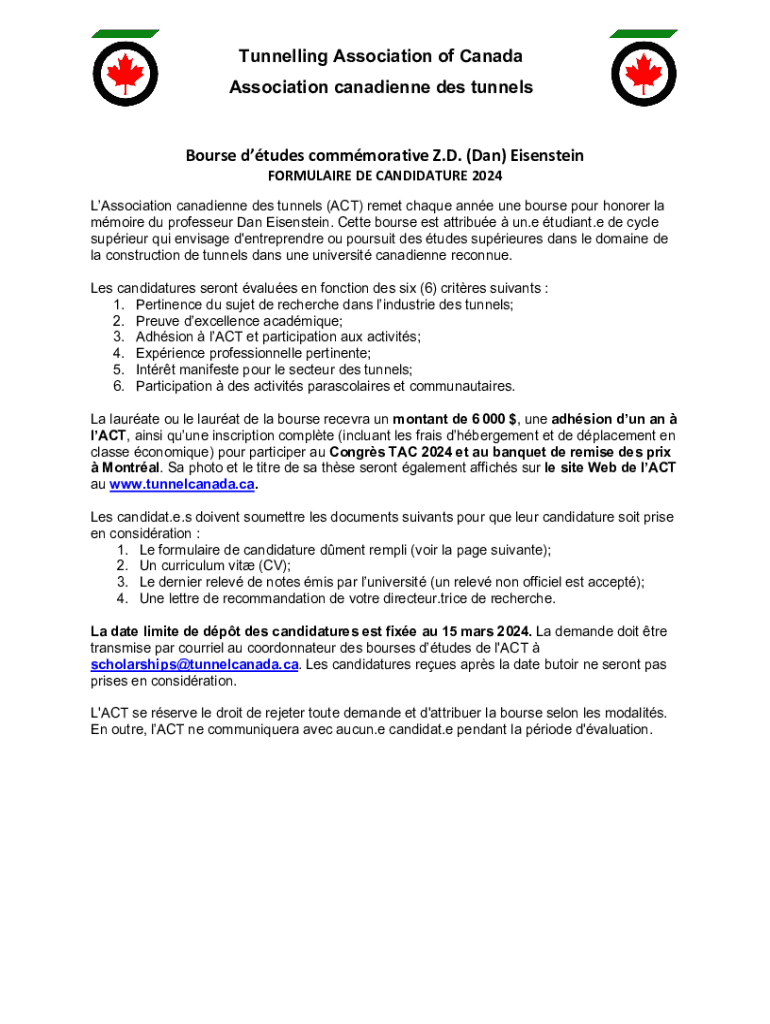 Tunnelling Association of Canada Association canadienne des tunnelsBourse dtudes commmorative Z.D. (Dan) Eisenstein FORMULAIRE DE CANDIDATURE 2024 LAssociation canadienne des tunnels (ACT) remet chaque