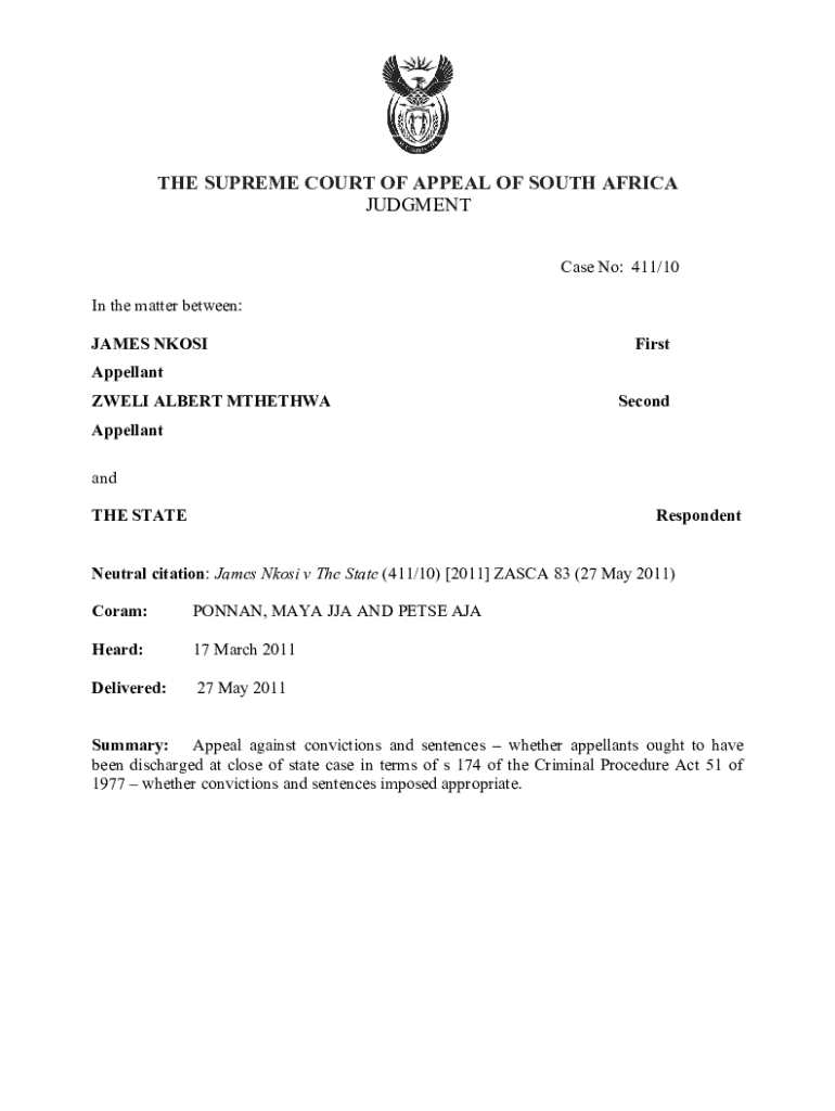 THE SUPREME COURT OF APPEAL OF SOUTH AFRICA JUDGMENT Case No: 411/10 In the matter between: JAMES NKOSIFirstAppellant ZWELI ALBERT MTHETHWASecondAppellant and THE STATERespondentNeutral citation: