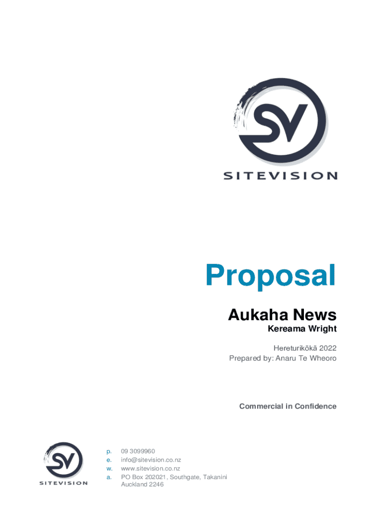 Proposal Aukaha News Kereama Wright Hereturikk 2022 Prepared by: Anaru Te WheoroCommercial in Confidencep. e. w. a.09 3099960 info@sitevision.co.nz www.sitevision.co.nz PO Box 202021, Southgate, Takanini