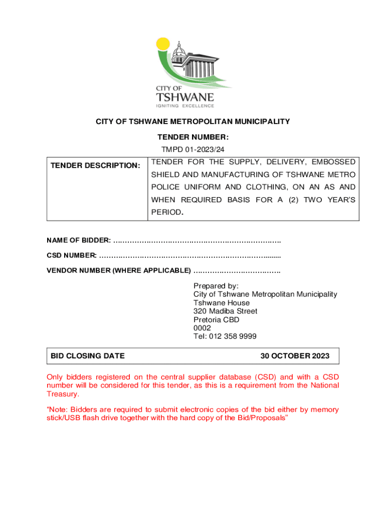 This document outlines the tender for the supply, delivery, embossed shield, and manufacturing of Tshwane Metro Police uniforms and clothing on an as-and-when-required basis for a period of two years. It includes the requirements for bidders, conditions of submission, the scope of work, and contact details for the submission process.