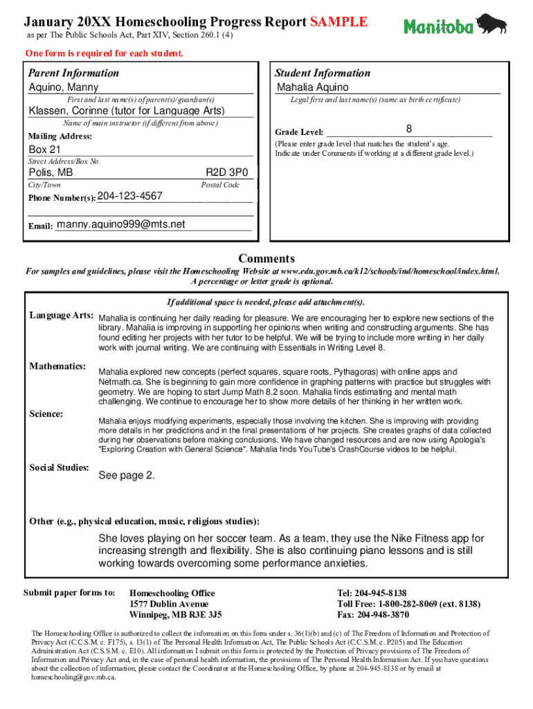 This document is a sample progress report for homeschooling students, following the guidelines established by the Public Schools Act. It includes sections for student information, parent details, and a detailed description of the student\'s academic progress in various subjects, along with comments and suggestions for improvement.