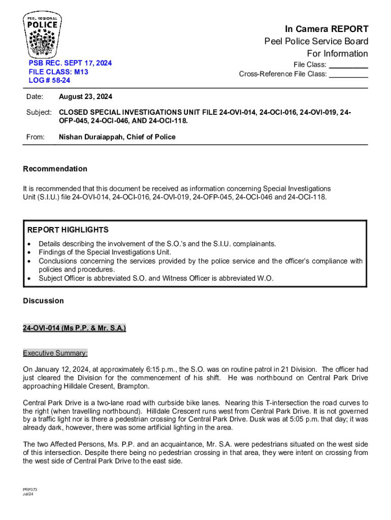 PSB REC. SEPT 17, 2024 FILE CLASS: M13 LOG # 5824 Date:In Camera REPORT Peel Police Service Board For InformationFile Class: ___ CrossReference File Class: ___August 23, 2024Subject: CLOSED SPECIAL