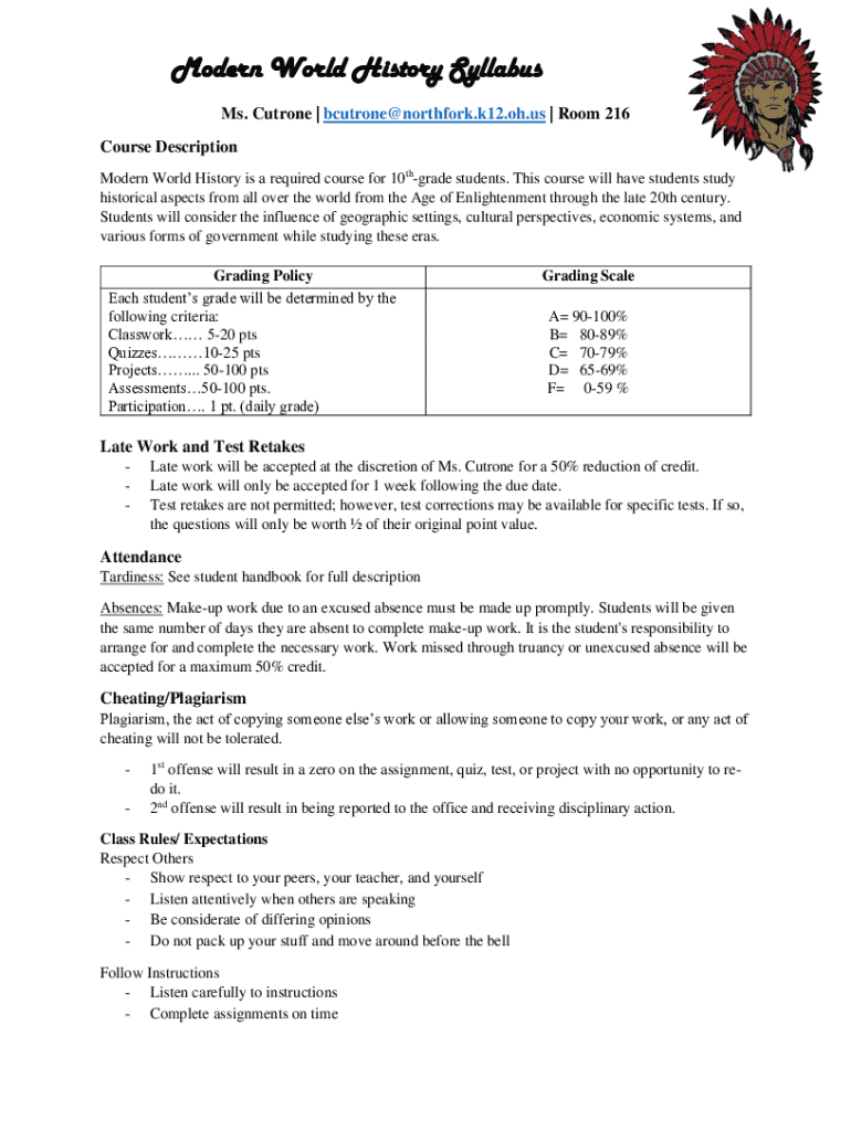 Modern World History Syllabus Ms. Cutrone | bcutrone@northfork.k12.oh.us | Room 216 Course Description Modern World History is a required course for 10thgrade students. This course will have students