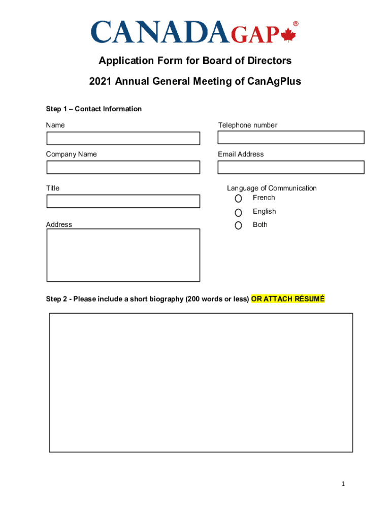 Application Form for Board of Directors 2021 Annual General Meeting of CanAgPlus Step 1 Contact Information NameTelephone numberCompany NameEmail AddressTitleLanguage of Communication French EnglishAddressBothStep