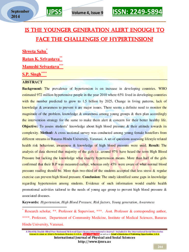 This study assesses the knowledge, attitudes, and awareness of hypertension among young female hostellers at Banaras Hindu University in Varanasi. It highlights the increasing prevalence of hypertension, particularly in developing countries, and the need for health education among the youth to prevent high blood pressure and its associated health risks.