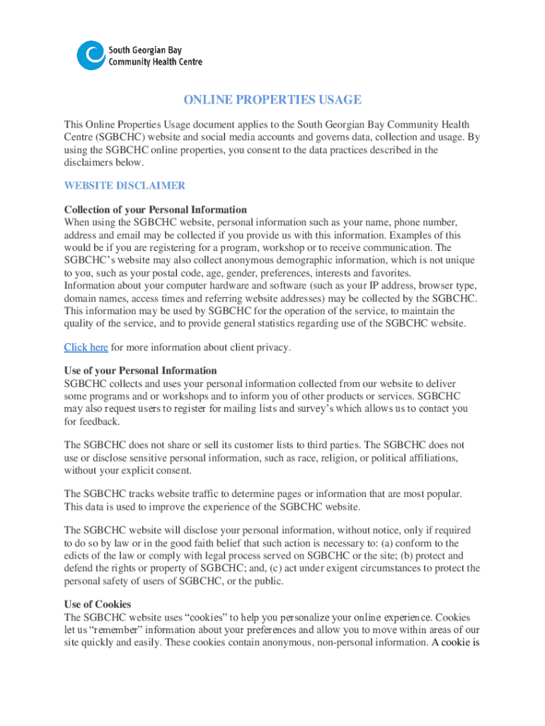 ONLINE PROPERTIES USAGE This Online Properties Usage document applies to the South Georgian Bay Community Health Centre (SGBCHC) website and social media accounts and governs data, collection and