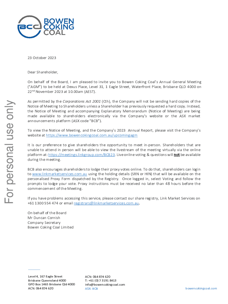 This document serves as the official notice for the Annual General Meeting (AGM) of Bowen Coking Coal Limited. It outlines the meeting details, including date, time, venue, and procedures for voting and proxy appointments. The notice also includes resolutions to be voted on by shareholders, including the adoption of the remuneration report, re-election of a director, ratification of previous share issues, and approval for the issuance of warrants.