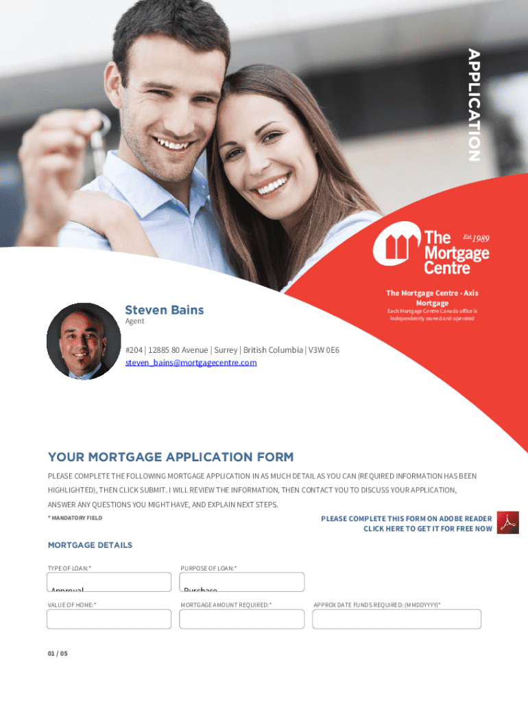 The Mortgage Centre Axis MortgageSteven BainsEach Mortgage Centre Canada office is independently owned and operatedAgent#204 | 12885 80 Avenue | Surrey | British Columbia | V3W 0E6 steven_bains@mortgagecentre.comYOUR
