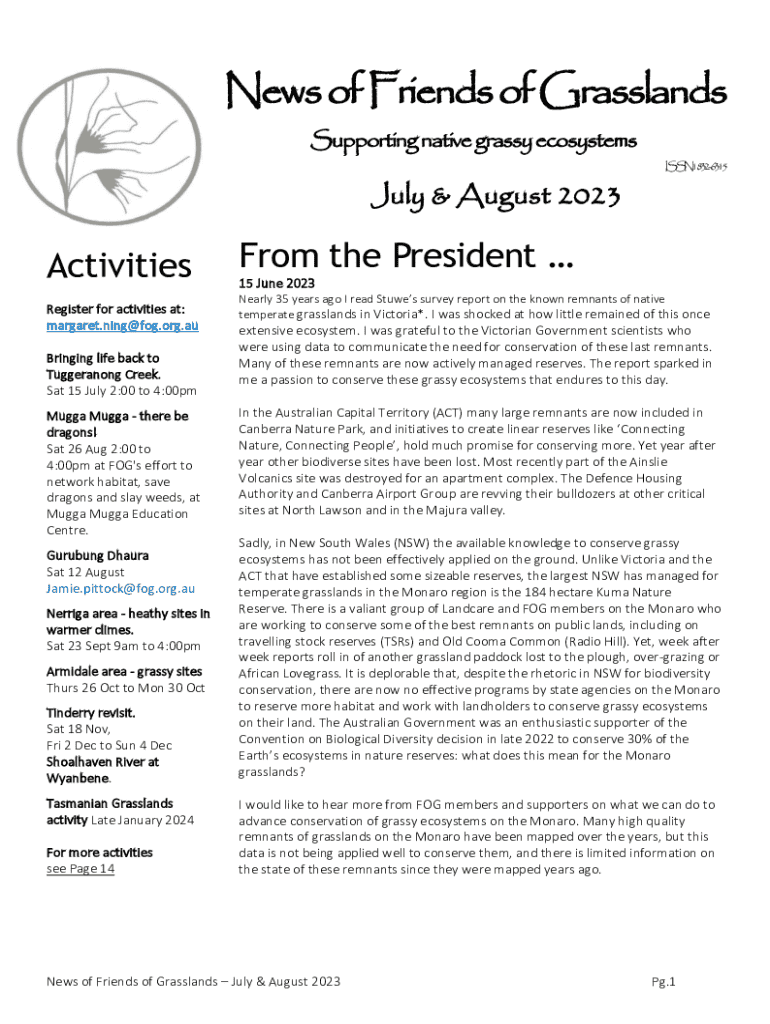 This newsletter outlines the activities, advocacy reports, and updates from the Friends of Grasslands, focusing on the conservation of native grassy ecosystems and ongoing projects related to habitat restoration, biodiversity, and invasive species management in Australia.