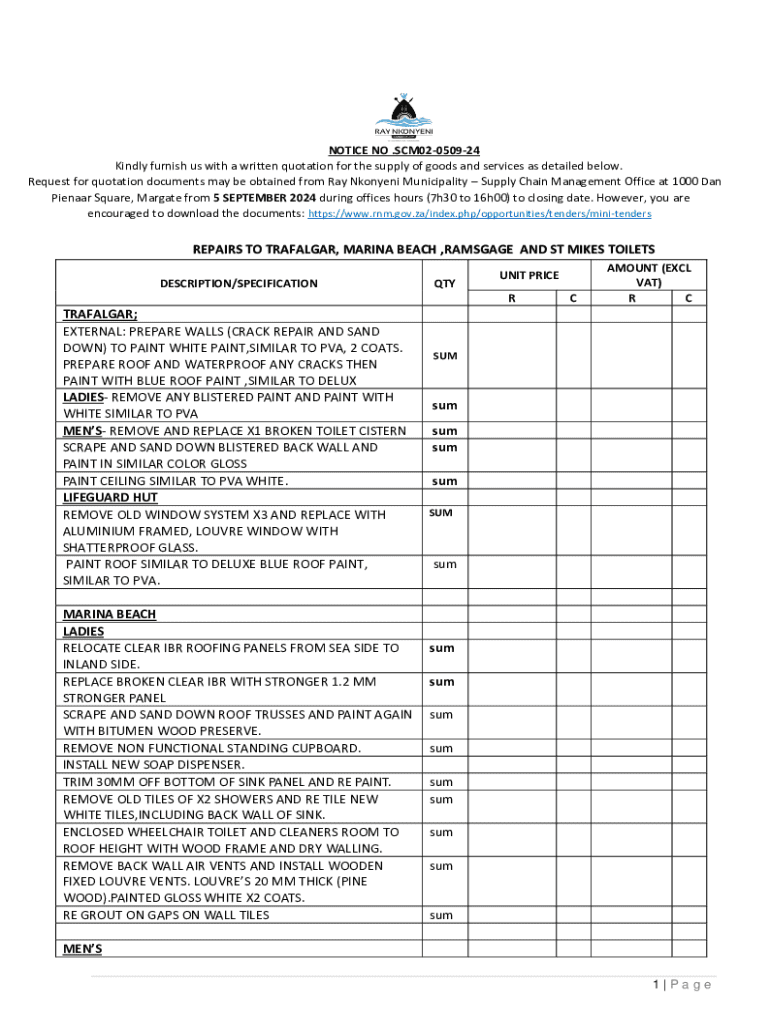 This document is a request for written quotations for the supply of goods and services related to the repair and maintenance of toilets at various locations including Trafalgar, Marina Beach, Ramsgate, and St. Mikes. It details the specifications, quantities, and requirements for the repairs needed, as well as submission instructions for the quotations.