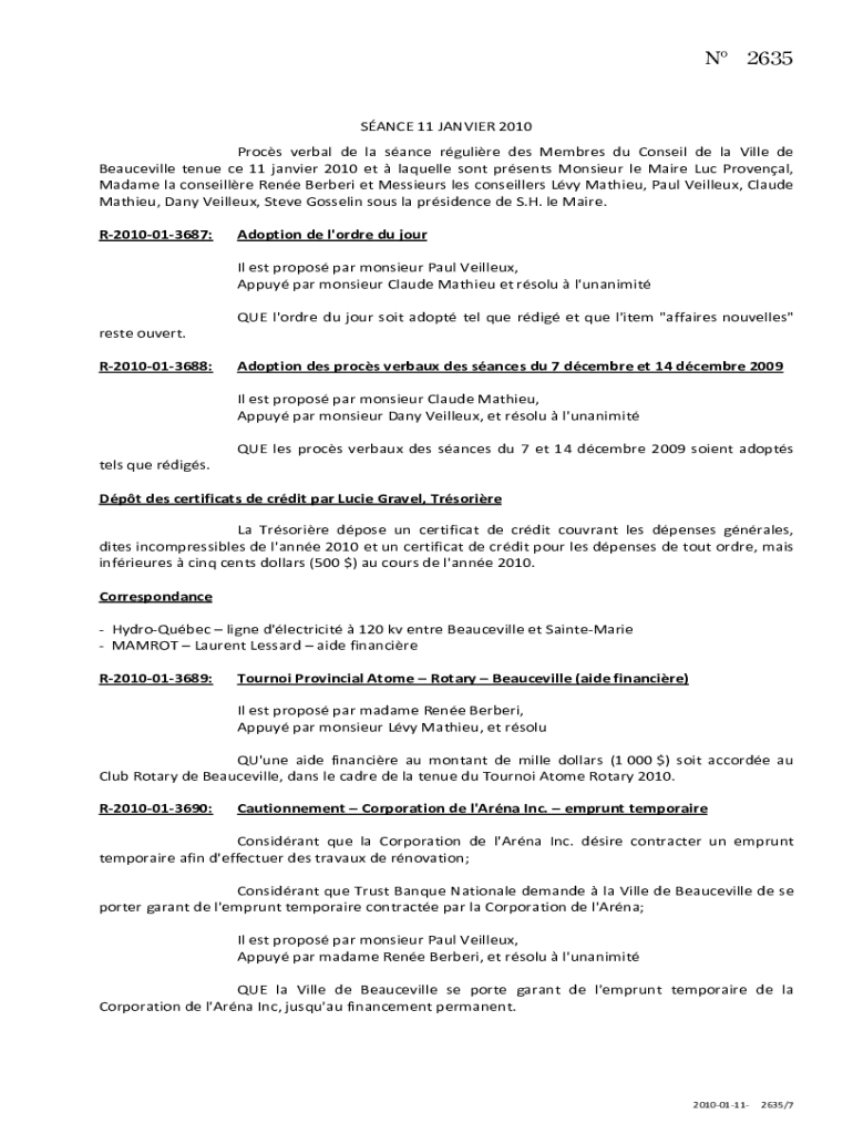 No 2635SANCE 11 JANVIER 2010 Procs verbal de la sance rgulire des Membres du Conseil de la Ville de Beauceville tenue ce 11 janvier 2010 et laquelle sont prsents Monsieur le Maire Luc Provenal, Madame