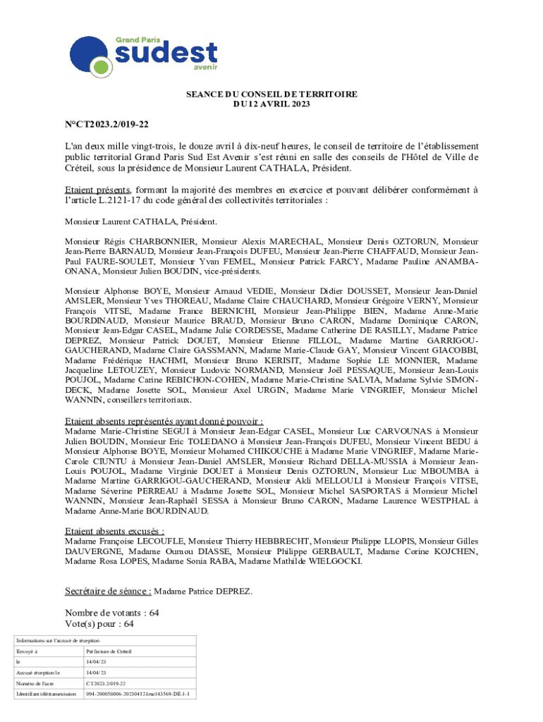 SEANCE DU CONSEIL DE TERRITOIRE DU 12 AVRIL 2023NCT2023.2/01922 L\'an deux mille vingttrois, le douze avril dixneuf heures, le conseil de territoire de ltablissement public territorial Grand Paris