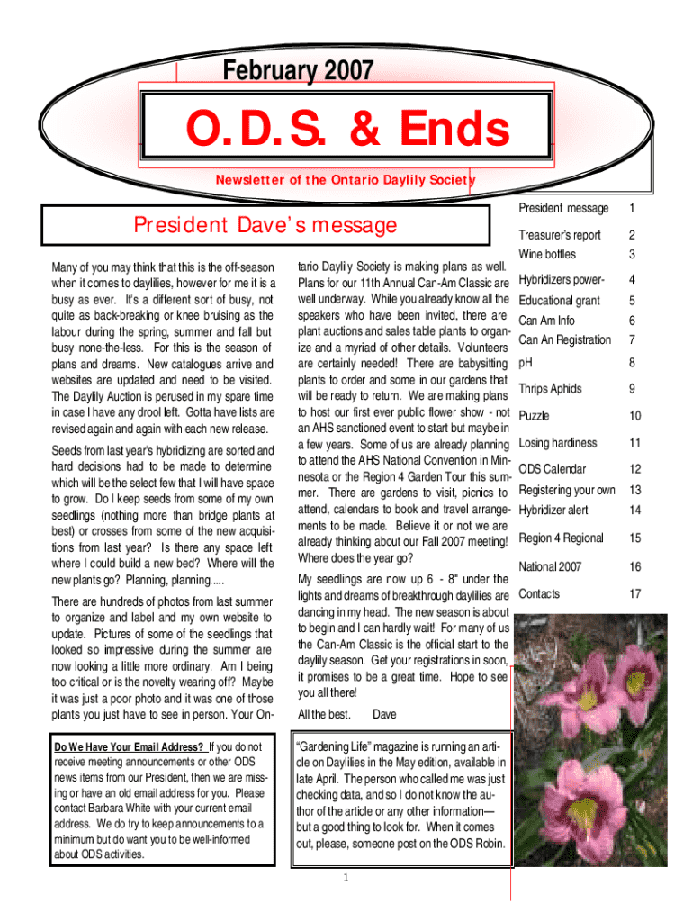 The February 2007 newsletter of the Ontario Daylily Society includes messages from the president, updates on events, treasurer\'s report, educational topics about daylilies, and announcements regarding upcoming meetings and conventions.