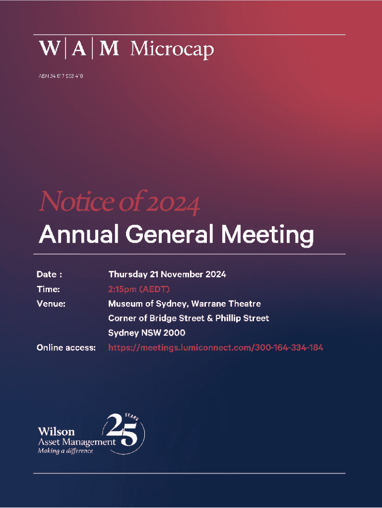 Notice of 2024 Annual General Meeting Notice is given that the 2024 Annual General Meeting (AGM) of members of WAM Microcap Limited (the Company) will be held as follows: Date Time Venue Online AccessThursday