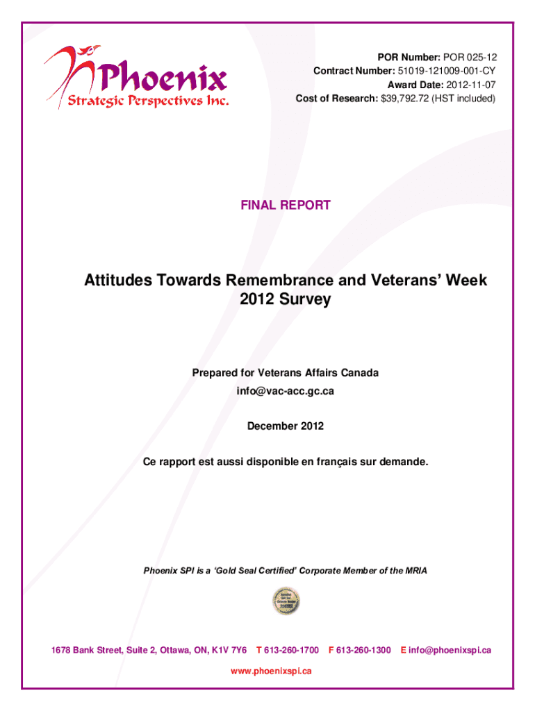 POR Number: POR 02512 Contract Number: 51019121009001CY Award Date: 20121107 Cost of Research: $39,792.72 (HST included)FINAL REPORTAttitudes Towards Remembrance and Veterans Week 2012 SurveyPrepared