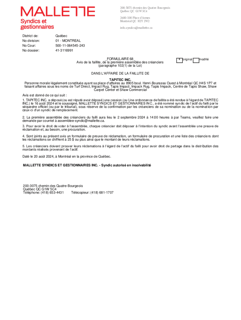2003075 chemin des QuatreBourgeois Qubec QC G1W 5C4 2600500 Place dArmes Montral QC H2Y 2W2 info.syndics@mallette.caDistrict de: No division: No Cour: No dossier:Qubec 01 MONTRAL 50011064545243 413116991
